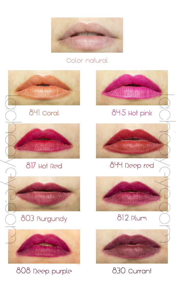 812 Plum: Mi color favorito para diario en invierno! Si algo me gusta, suelo dejar de probar y quedarme ahi… y eso me ha pasado con este color. A la que hace tiempo de chaqueta hace tiempo de labios color ciruela. Esta entre el rojo y el púrpura, oscuro y frio. Perfecto para mi pálido color de piel. La pigmentación buena, pero podría ser mejor.